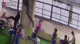 从校方提供的监控视频中可以看到,在活动室内,一位男老师连续高抬腿,把脚伸向至少3名女学生的脸部。其中一位女生边抹眼泪边收拾书本离开……