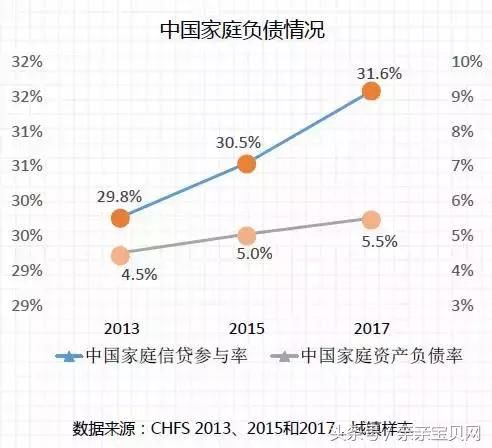 《报告》显示,中国城镇家庭资产负债率从2013年的4.5%增至2015年的5%,2017年再增至5.5%。