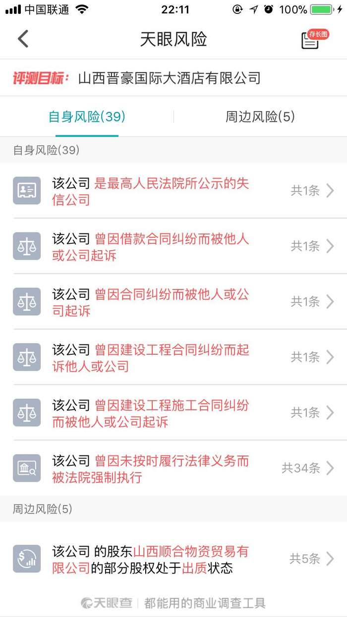 与此同时,近年来该公司还与五矿国际信托有限公司、中国民生银行股份有限公司太原分行、江苏南通六建建设集团有限公司等产生过借款、工程等合同纠纷,其中,在与河南省中岩建设基础工程有限公司一案中,晋豪国际大酒店表示,中岩公司诉情的工程款欠款没有异议,利息、诉讼费暂时无力承担。