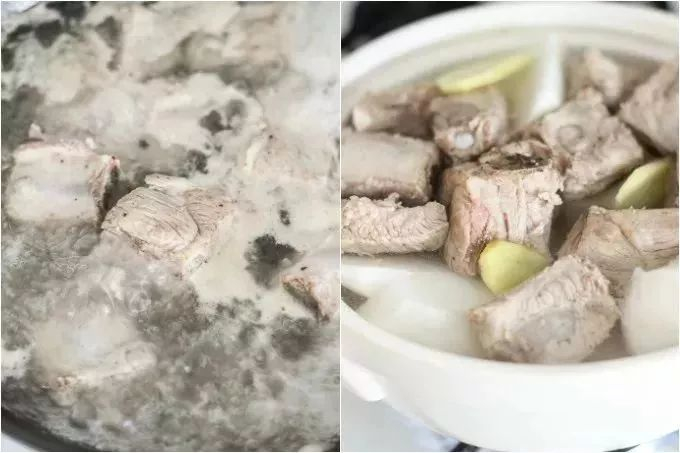 2、将排骨放入锅中,加入水、少量姜片和几个蒜瓣,中火煮至沸腾,大约40分钟即可;