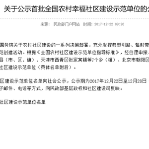 22日,国家民政部发布公示称,拟确定23个县(市、区、旗)、7个乡(镇)和104个村(农村社区)为首批全国农村社区建设示范单位。