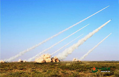 ↑火力-2017·青铜峡:9月25日,红方参演炮兵部队——陆军第71集团军某炮兵旅远程火箭炮进行昼间实弹射击。(彭希摄影)