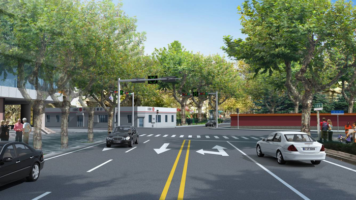 3、莱阳路金口一路增设信号灯,增设倒L灯杆,横臂设置金口一路出车信号灯,灯杆竖臂上设置莱阳路信号灯;