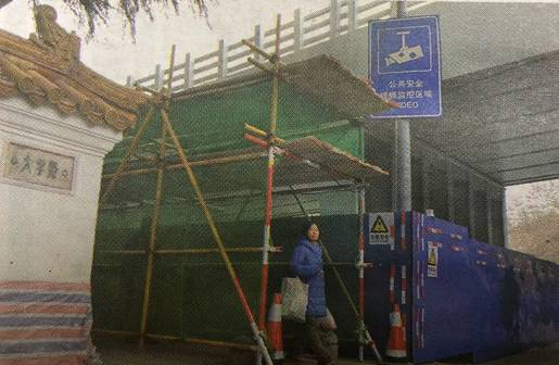 ▲大学路临时跨线桥下已经搭起了人行通道。