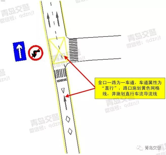 金口一路南进口渠化为1车道,车道属性为“直行”;路口内施划黄色网格线及直行车流导流线。