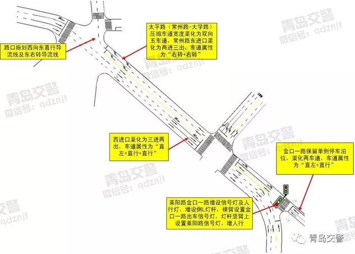 1、太平路(常州路-大学路)压缩车道宽度渠化为双向5车道,常州路东进口渠化为2进3出,车道属性为“右转+右转”,路口施划西向东直行导流线及东右转导流线;