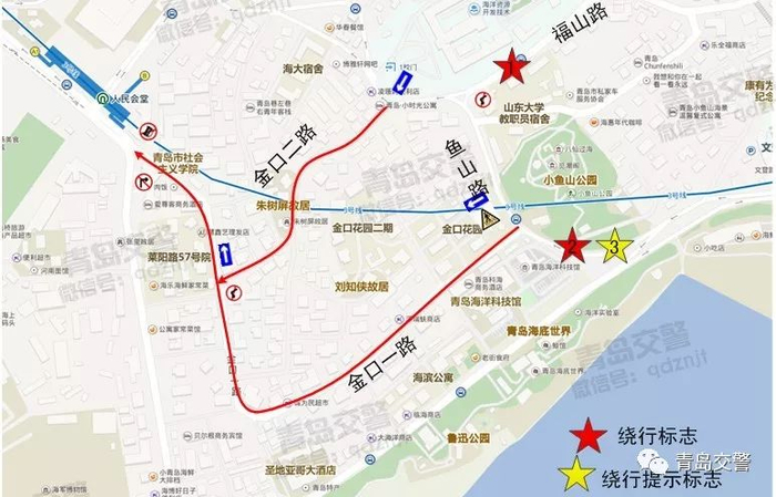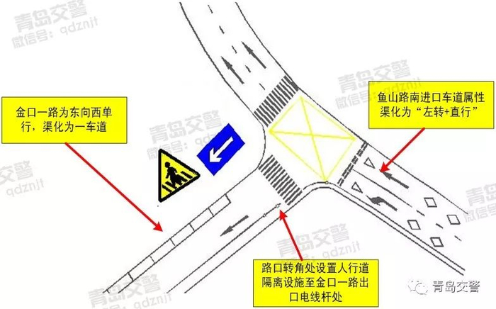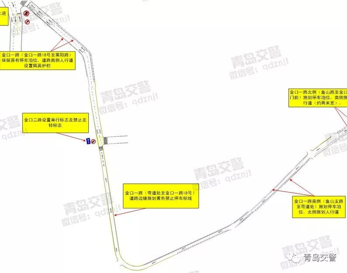 1、金口一路(鱼山路-莱阳路)路段设置为东向西单行线路;金口二路(鱼山路-金口一路)路段设置为北向南单行线路。