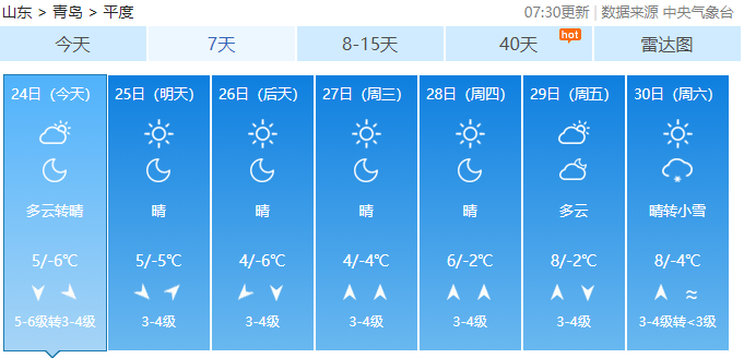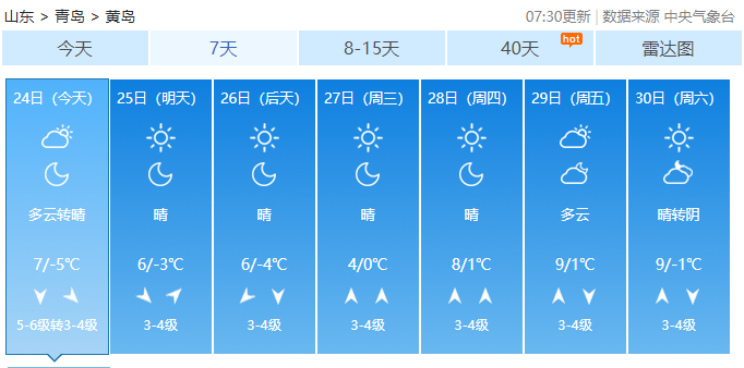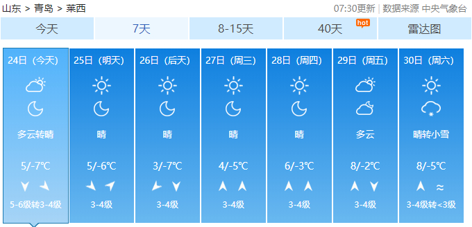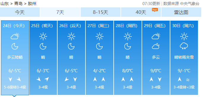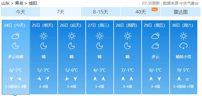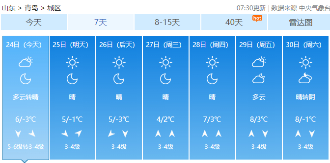 据青岛气象台12月24日6时发布的天气预报: