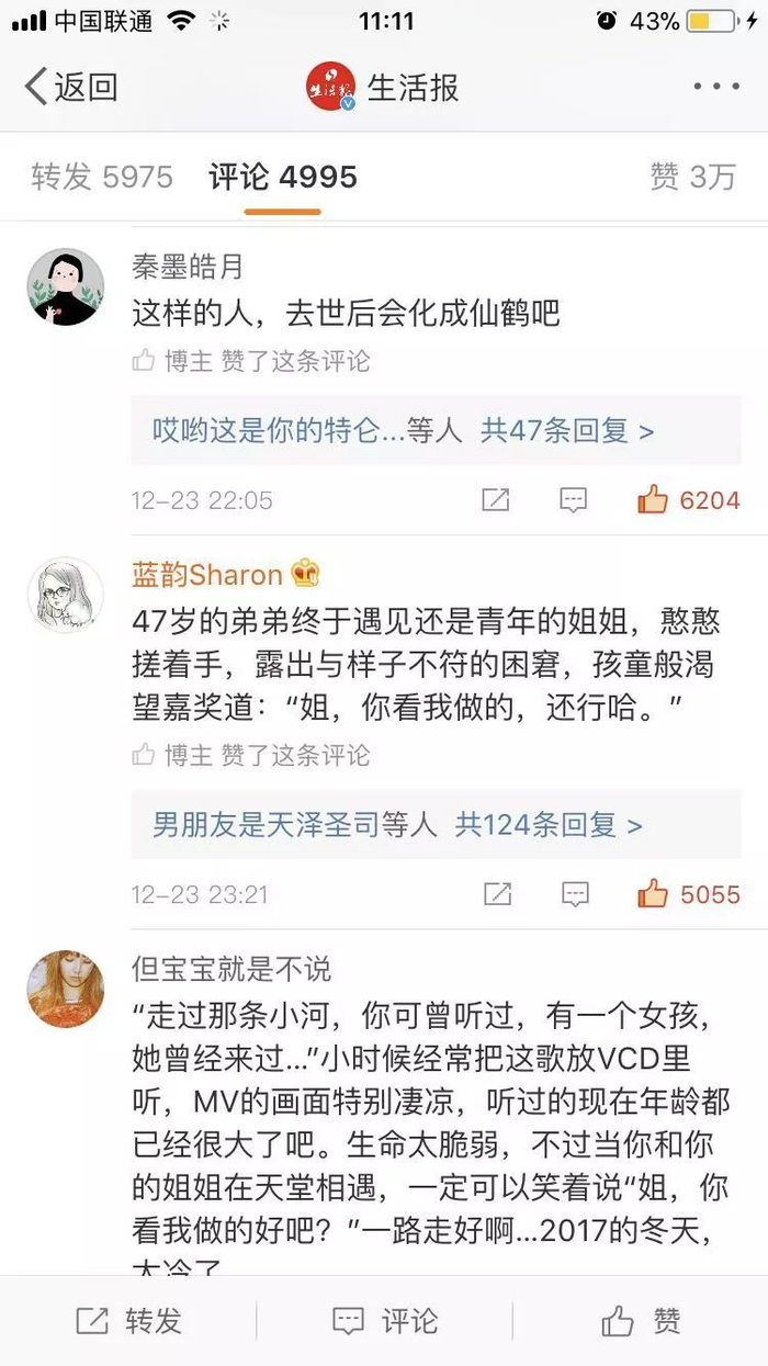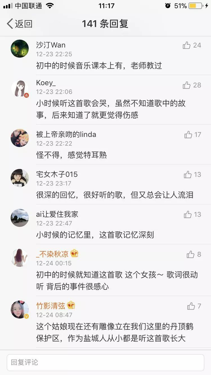 12月23日晚,生活报官方微博转发了有关徐家三代守护珍禽的感人事迹的微博, 阅读量突破1000万,近6000名网友留言,很多留言十分感人,还有一些留言的网友来自徐秀娟烈士的牺牲地——江苏盐城:
