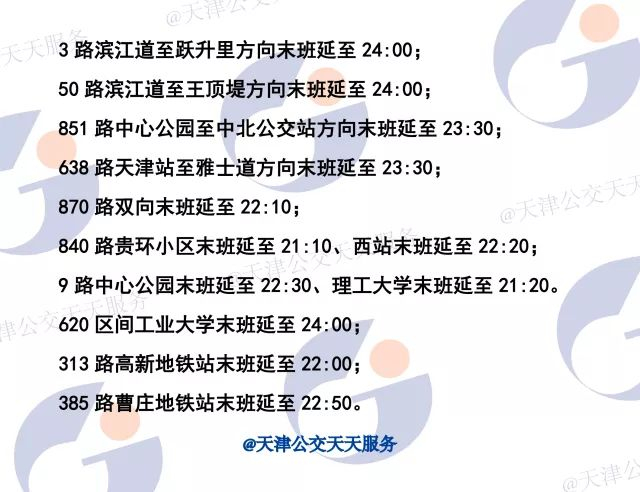 津滨轻轨9号线开往东海路方向运营时间较平日延长1小时,由22:30延至23:30,25日00:34结束运营;开往天津站方向末班车时间仍为22:30。