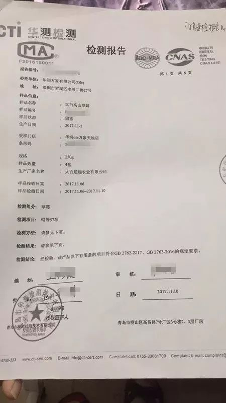 根据青岛市华测检测技术有限公司提供的一份检测报告,检测对象为华润ole万象天地店的4盒太白高山草莓,检测范围是57项农残物质。