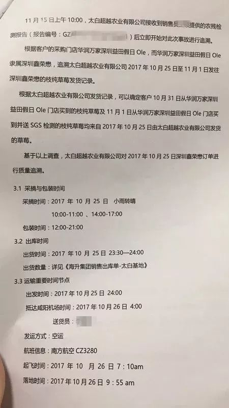供应商太白超越农业有限公司对此出具了文件,介绍了该批草莓采收前的植保作业情况和出厂检测结果,均显示无异常。