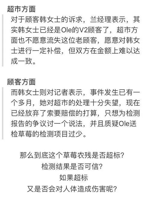 就此,记者联系到华润万家有限公司,其Ole市场部一名相关负责人兰经理介绍,在11月2日韩女士来店投诉后,公司便立即在全国Ole分店下架了同品种的草莓,并把深圳几家门店售卖的同一批进货的草莓也送交了第三方检测机构(益田广场店除外,因为当批草莓已被韩女士买光)。