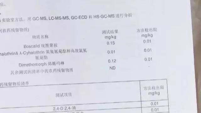 但报告并未附上这些农药残留物质的参考最大含量,并也注明:“本报告的检验数据和结果仅供客户内部使用,不对社会具有证明作用。”