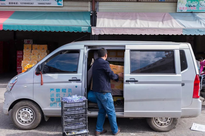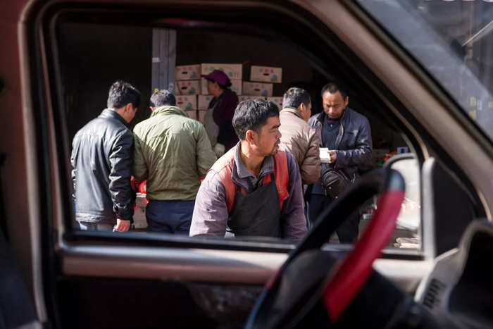 路边早点摊是司机们交流拉货“战果”的聚集地。上午9点,阳光打在汽车顶,一夜未挪动的私家车挡风玻璃上罩了层白色雾气,气温逐渐上升,聚拢的水汽顺着玻璃往下流,昆明建材商业城附近等待拉货的微型车也越来越多,逐渐将人行道两侧的空位填满。蒋鹏将他的微型车停在早点摊后,摇下车窗,冲临街卖早点的中年妇女叫了碗米线。
