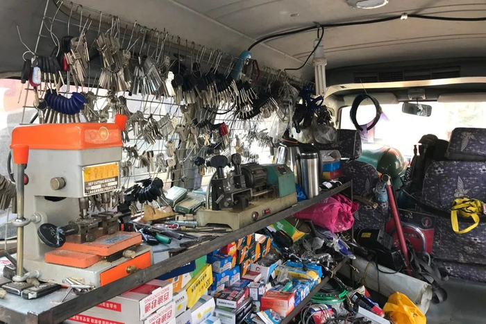 为了能堆放下更多东西,李爱梅把车内的两排后座全部卸下,挨着车体一侧搭了张铁丝网,上面用铁钩挂着上百把待配的钥匙;下面手工焊制的两层铁架上,摆放了两台配钥匙的机器,下层整齐地码放了一些单车配件,修理用的工具散落在车厢各个角落。