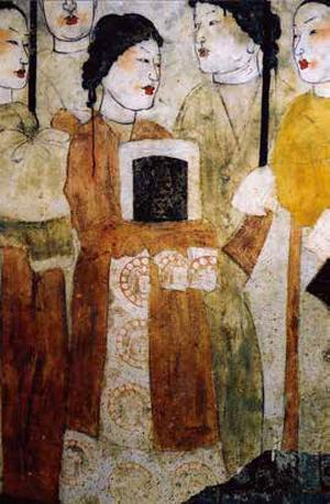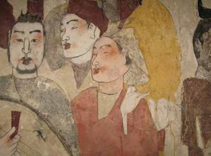 2、墓室东壁壁画中女主人二贴身侍女梳理着一种前所未见的“发型”,也有人认为是帽子或假发。其渊源似乎可以追溯到印度阿旃陀佛教石窟壁画中。