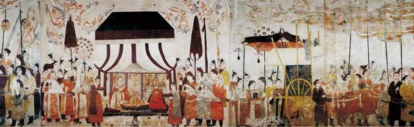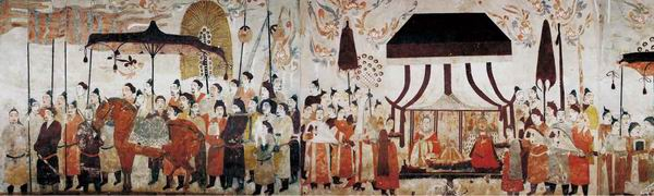 山西太原自古就是兵家必争之地,更是民族融合和文化碰撞的前沿阵地。通过考古发现,山西太原的墓室壁画充分证明了这一地区华夏文明与西域文明的交流与融合。其中,太原迎泽区王家峰村梨园内所发掘的北齐徐显秀墓就是最好的例证。徐显秀墓的价值不仅体现在绘画方面,而且表现在对当时现实社会生活的描绘上。徐显秀墓壁画布局代表着墓室壁画一种新的格局的产生。它直接影响到唐代墓葬壁画的布置,开唐墓壁画绘画布局之先河,如永泰公主墓壁画就继续了徐显秀墓壁画布局,长卷式一气呵成。众所周知,唐朝政权肇基于晋阳,其文化也有北齐晋阳的浓重色彩,或者可以说北朝晋阳文化为唐文化渊流之一,这或许是徐显秀墓文化信息带给我们的新启示。