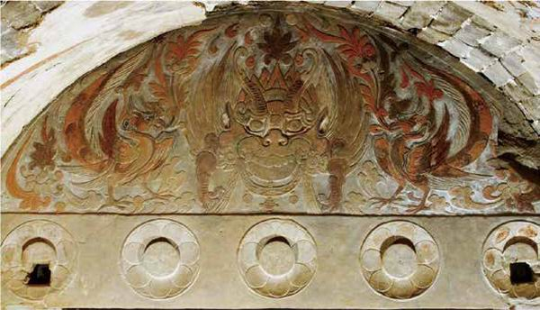 5、甬道石门浮雕的图像造型和雕刻技法,特别是石门扇上兽头怪鸟形象也有明显的外来风格。最明显的是两扇石门上部——草食类曾头、鸟身、蹄足,口衔瑞草的浮雕怪鸟。有研究者认为,此形象虽不是典型的祆教神鸟,但肯定与中亚文化有关。更加耐人寻味的是,石门下部原雕刻为中国传统意义上的青龙和白虎,但在最后进行彩绘时,上部的怪鸟依浮雕原形着色,下部青龙和白虎则分别被改绘成"鸟"的形象。这种覆盖与取代的结果是,最后展示给观众看的是四只“鸟”,而且决不是中国的朱雀!此“鸟”取代了中国传统的方位神祗,说它是一场文化冲突的胜利者也不为过。
