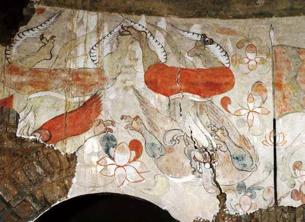 墓室除有几处盗洞外,壁面规整,绘画色彩如新,没有任何水渍泥污,仿佛就是一座刚刚绘就的地下美术馆,这种情形在墓葬考古中极少见到。一般而言,古墓埋藏在地下,长期受到地震、水患等自然灾害的破坏,有的发生坍塌、有的被水浸淹。考古工作中,打开墓室,要么室内塞满淤土,要么水锈侵蚀痕迹遍布,泥水横流,显得污秽不堪。而这座墓葬墓室空旷,墓室干净。正是这样的墓室环境,才为我们保留了完整如新的墓室壁画,难能可贵。