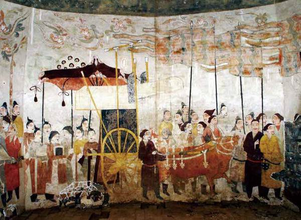 太原北齐徐显秀墓墓室壁画东壁 《牛车侍女图》