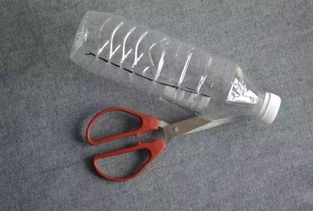 首先准备一个废弃的塑料瓶和一把剪刀,并且用记号笔在塑料瓶上画两条平行线。