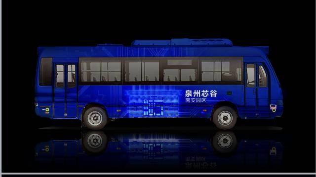 蓝色的车身,加上芯片、闽南古厝、海洋等元素,在充满科技感和现代感的同时,又不失石井滨海民俗特色。