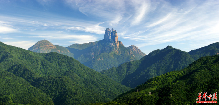 仰望耸立于峰顶最高处的巨石,其底部庞然卧于峰顶处坪地,面腰部忽然拔地而起,一分为三,直插天际,石顶上覆盖有绿色树丛,傲然挺立于天空,堪称真正的“南天一柱”。