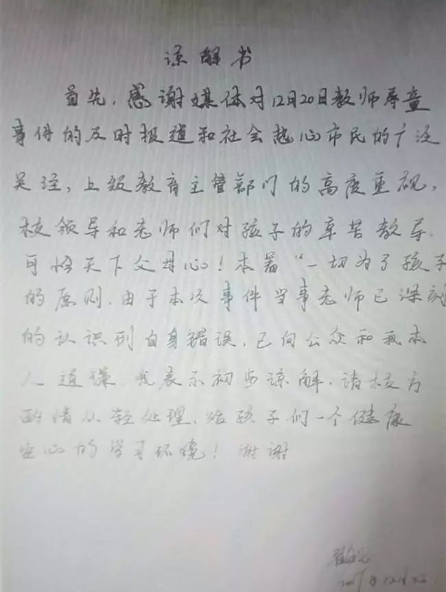 可怜天下父母心!本着“一切为了孩子”的原则,由于本次事件当事老师已深刻的认识到自身错误,已向公众和我本人道歉,我表示初步谅解、请校方酌情从轻处理,给孩子们一个健康安心的学习环境!谢谢