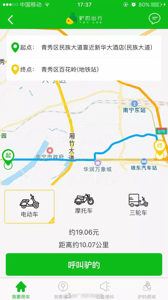 据广西新闻频道,最近,南宁就出现了一群身穿荧光绿外套,头戴小红帽,走在路上非常显眼的电动车“司机”。据了解,这个约车平台名叫驴的(音同“滴”)出行,下载APP后需要先进行手机注册才能使用。在南宁,很多人都把电动自行车叫做电驴,所以“驴的出行”也被戏称为“滴滴打驴”。