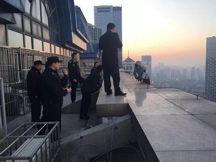 早在12月19日,某大厦物业公司工作人员就发现楼顶有人在墙壁上留言说要跳楼自杀。南京路派出所接此警情,经排查没有发现异常,为防止意外发生,派出所加强监控值守,组织保安员对顶层加强巡逻。21日16:00,保安员在楼顶巡逻时果真发现有人坐在顶楼天台欲跳楼自杀,随后拨打110报警。
