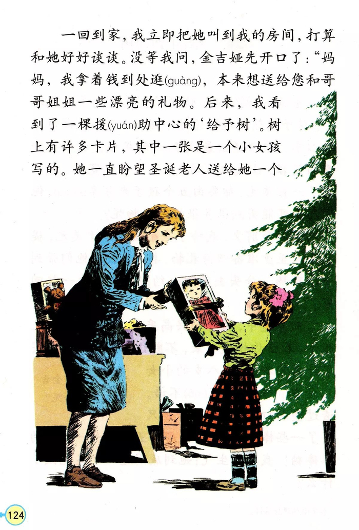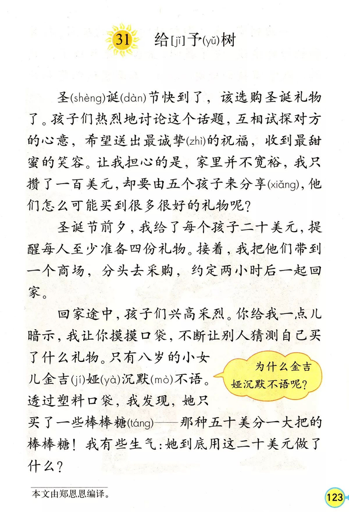 《给予树》由郑恩恩编译。课文写的是在圣诞节到来之前,小女儿金吉娅把应该给家人买礼物的钱买了一个洋娃娃,送给了一个素不相识的需要帮助的女孩。课文赞扬了金吉娅的爱心和她的善良品质。