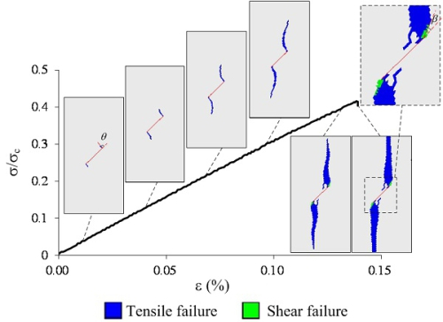 利用基于以上准则开发的软件模块,研究者对加拿大深部地下工程实验室进行了模拟。在模拟过程中,研究者发现其不但可以模拟楔形的破坏形状,而且能够重现张拉脆性破坏机理以及小湾高拱坝坝基开挖葱皮破裂、锦屏一级高拱坝边坡左岸深部裂缝、锦屏二级强烈岩爆等高应力地区高储能岩体的独特破坏现象。该项成果可为许多岩体破坏现象形成机理的揭示及其未来演化路径的预测、相关工程预案的制定提供参考。该研究还利用Gaussian分布表征岩样中不同矿物成分的变形、强度等力学参数非均匀性,结合提出的强度准则,基于连续介质理论,成功模拟了细观非均匀岩体起裂、裂纹扩展的渐进破裂过程。