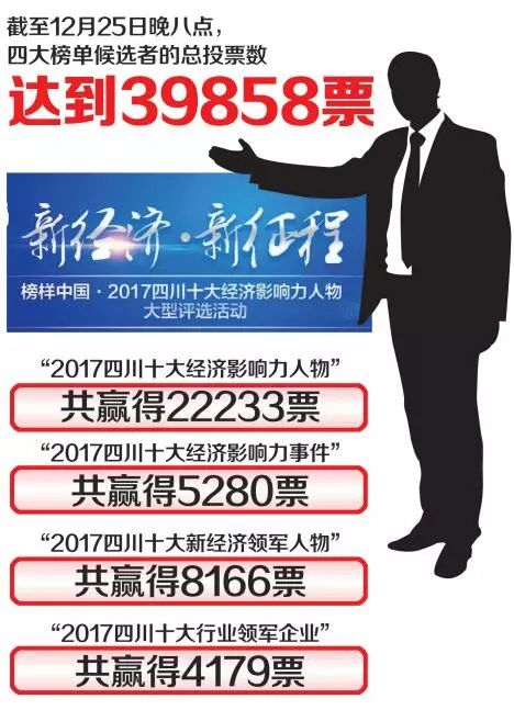 正是有这些热心市民的参与,榜样中国·2017四川十大经济影响力人物评选活动首日反响热烈。截至12月25日晚八点,为四大榜单候选者投票的总票数就达到了39858票。
