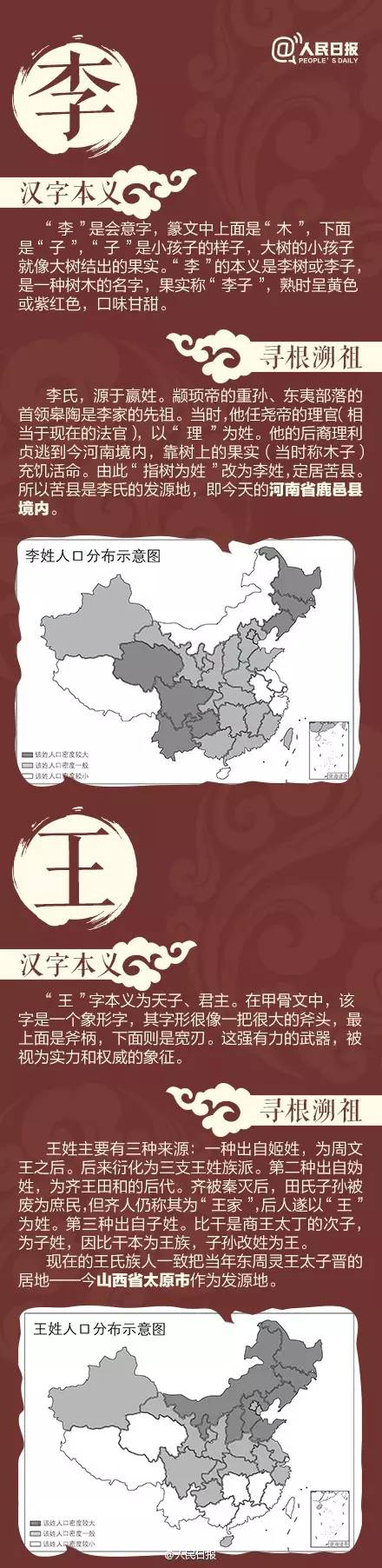 编者按:据估计,中国87%的人口都姓着百家姓中的姓氏,逾1/5的中国人姓李、王或张,总共超过2.75亿人。大多数中国姓氏都在中国境内有一个地理“基础”,这一点较少为人所知。一些有趣的地图告诉我们,哪些姓氏在中国的哪里最为集中。大家都来看看你的根在哪里?