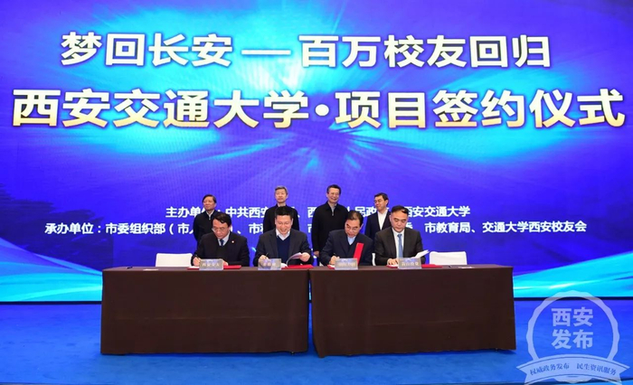 签约仪式现场,市政府副市长方光华介绍了西安市支持校友回归的六条措施,西安交通大学副校长席光发表了校友回归振兴大西安的倡议书,展现西安愿与所有高等院校携手前行,共同谱写校地融合发展的新篇章。