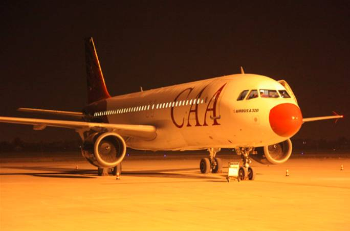 由江苏工程职业技术学院购买的空客320飞机从法国途经哈萨克斯坦飞抵南通,在夜幕中降落兴东机场。学校供图