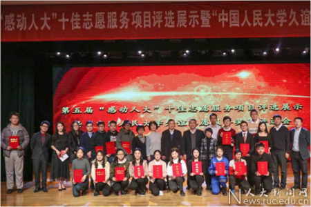 “感动人大”十佳志愿服务评选活动自2007年启动至今已成功举办五届,本届一等奖获得项目——学校外来务工人员文化服务项目创办于2012年,至今服务校内外来务工人员上千人,相关事迹曾在《人民日报》、《中国青年报》、《南方周末》等媒体刊登,在校内外形成了良好反响,展现出人大学子服务祖国、服务社会、服务人民的人文情怀与时代担当的志愿精神。