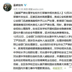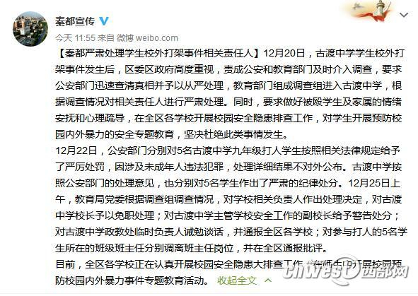 西部网讯 12月20日,咸阳古渡中学学生校外打架事件发生后,秦都区委区政府高度重视,责成公安和教育部门及时介入调查,要求公安部门迅速查清真相并予以从严处理,教育部门组成调查组进入古渡中学,根据调查情况对相关责任人进行严肃处理。同时,要求做好被殴学生及家属的情绪安抚和心理疏导,在全区各学校开展校园安全隐患排查工作,对学生开展预防校园内外暴力的安全专题教育,坚决杜绝此类事情发生。