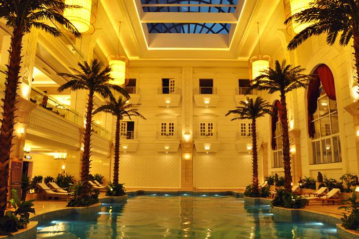 整个温泉区域有50000平方米,有SPA、按摩池、药膳房,养生六汤,沙疗、鱼疗池等70多个泡池,温泉馆内有93种海南植物,都是从海南岛运到宁夏的,堪称是银川城东一个超牛的室内植物园。