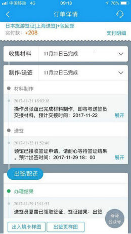 “我们在2014年就实现了签证进度跟踪显示,今年又投入开发丰富功能,全面升级覆盖更多的产品和目的地。”携程签证相关负责人介绍说,用户在手机上下单后,可随时收到签证办理进度,主要包括四个关键步骤:收集材料、制作材料、送签与领馆接收、出签与配送。时间甚至具体到几点几分几秒。比如,使领馆出签的同时,工作人员利用专门研发的“携程送签AI”进行签证状态的更新,客户在手机端订单中就可以同步收到。