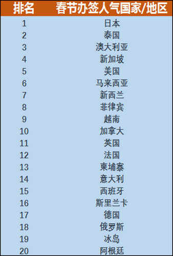 截至12月25日,国内最大的在线出境游旅行社携程旅游最近公布了春节出境旅游签证排行榜:其中日本、泰国、澳大利亚、新加坡、美国、马来西亚、新西兰、菲律宾、越南、加拿大位列前十,为中国游客在春节时期感兴趣程度最高的几个的国家。就办签证时长而言,排名前十的国家为:斯里兰卡、越南、新加坡、柬埔寨、马来西亚、日本、菲律宾、意大利、俄罗斯、泰国(办签时长由短到长排列)