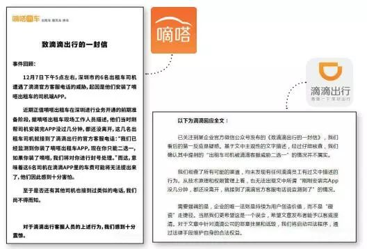 滴滴出行于次日回文称,“滴滴彻查了所有可能的渠道,均未发现有任何滴滴员工有过文中描述的行为。”滴滴表示,“从技术原理和权限管理上看,也无法出现文中所谓的‘刚刚安装完APP没几分钟,都还没离开,就接到了滴滴客服人员电话’的情况。”滴滴在文中直指嘀嗒拼车“碰瓷儿”。