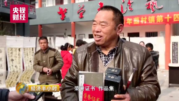 河南省永城市 某书法艺术有限公司负责人 魏东明:我们公司主要是,把这些农民书法家的春联作品,统一地印刷发行推出去,让农民书法家,都有一定的经济收入回报。