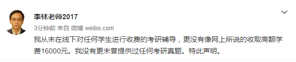 李林还表示,从未在线下对任何学生进行收费的考研辅导,没有像网上所说的收取高额学费16000元,未曾提供过考研真题。如有不实,愿负法律责任。