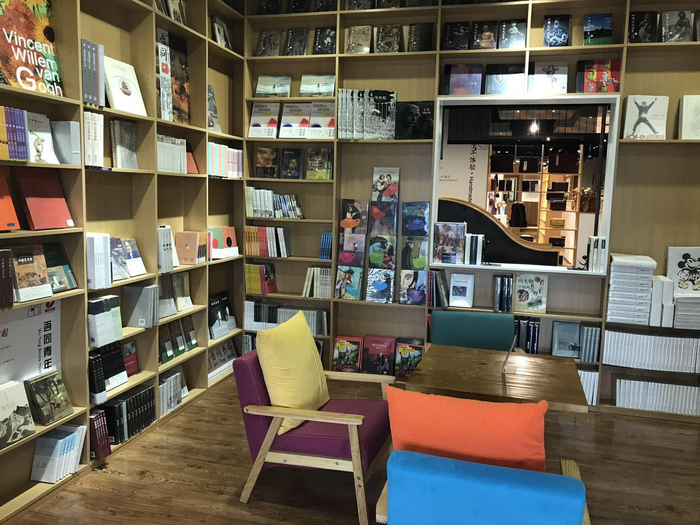 三楼引入了“吾同书局”,这是豫园的首家书局,不仅卖书,还销售各类文创产品、咖啡茶点以及举办文化讲座等,是一个新型业态的文化场所。在小校场年画等展览期间,这里也就呼应做相关主题的文化沙龙活动。