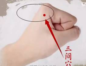 右手握拳,找到虎口处皮肤褶皱的地方,顺着褶皱往上推找到凹陷处,这里就是三间穴了。