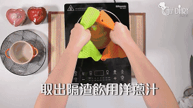 蒸好的洋葱取出,倒掉洋葱渣滓,保留洋葱汁
