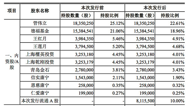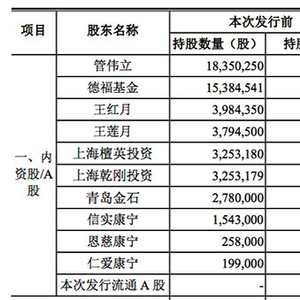 招股书显示,目前康宁医院持股5%以上的股东分别为管伟立、德福基金、王红月、王莲月。管伟立与王莲月为配偶关系,王莲月与王红月系姐妹关系。管伟立持有公司25.12%股份,王莲月持有5.20%股份,王红月持有5.46%股份。另外,法人股东德福基金持有21.06%的股份。管伟立及其配偶王莲月合计持有公司2214.475 万股股份,占公司总股本的 30.32%,为公司控股股东和实际控制人。