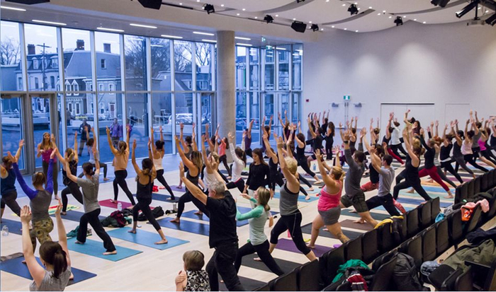 图书馆报告厅闲置的时候,人们可以在里面上瑜伽课